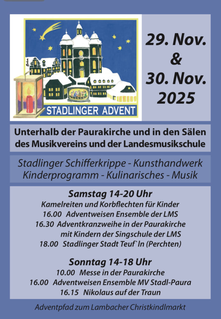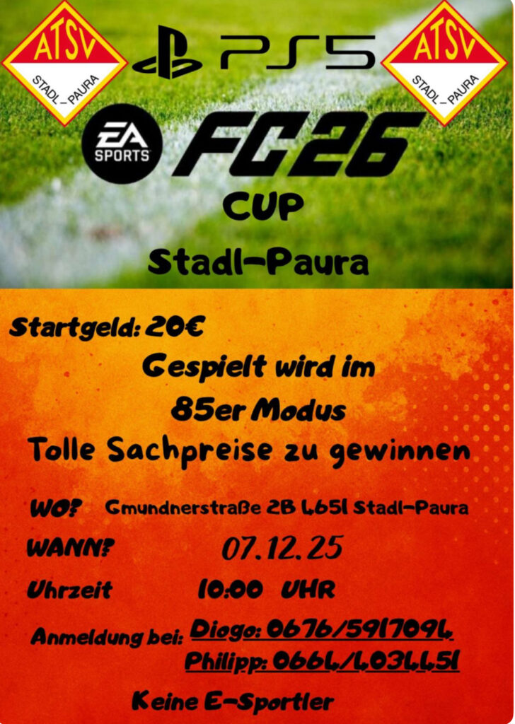 News BESUCHT UNS BEIM WEIHNACHTSMARKT AM 29. und 30.11. BEI DER PAURAKIRCHE — WIR FREUEN UNS AUF EUCH Nächster Termin: Stadlinger Advent am Fuße der Paurakirche PS5 – FC26 – Cup